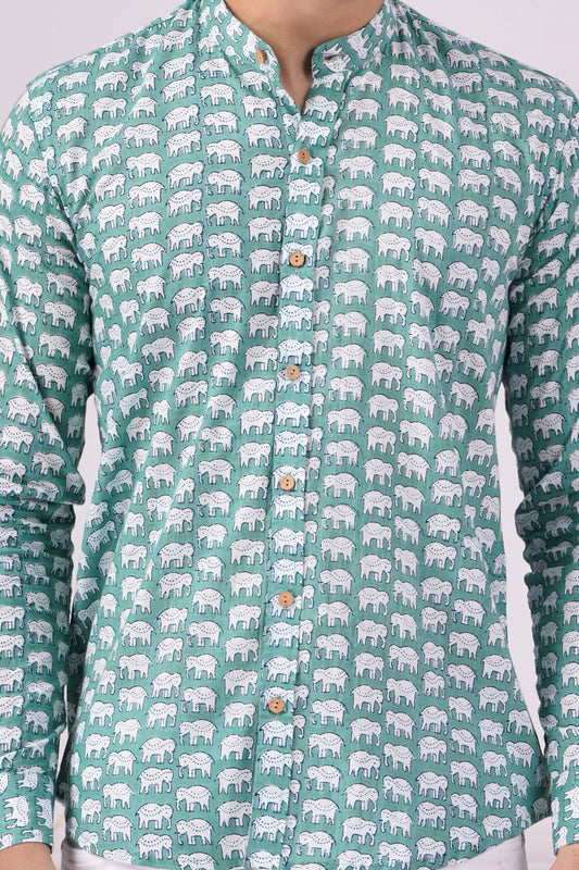 Green Majestic Elephant | Handmade Block Print Premium Cotton shirts for men | Slim Fit